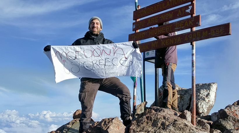 Όταν έφτασε στην κορυφή ανάρτησε πανό με το μήνυμα MACEDONIA IS GREECE.