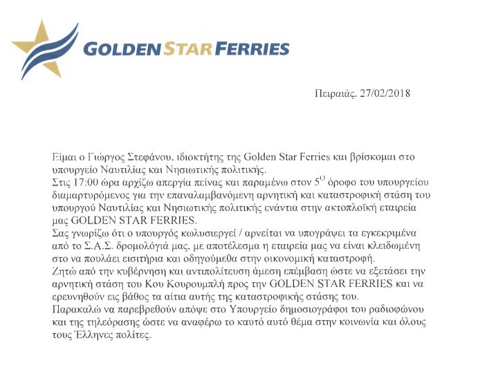 Στις 17:00 ωρα αρχίζω απεργία πείνας και παραμένω στον 5ο όροφο του υπορυγείο διαμαρτυρόμενος για την επαναλαμβανόμενη αρνητική και καταστροφική στάση του υπουργού Ναυτιλίας και Νησιωτικής πολιτικής ενάντια στην ακτοπλοϊκή εταιρεία μας Golden Star Ferries.
