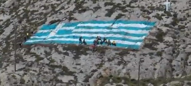 Μια τεράστια Ελληνική σημαία 375 τμ, (15 επί 25 μέτρα) ,ζωγράφισαν οι κάτοικοι στα βόρεια υψώματα της Πόθιας Καλύμνου, στο Μαυροβούνι, ακριβώς κάτω από το Εκκλησάκι της Ανάστασης και του Σταυρού.