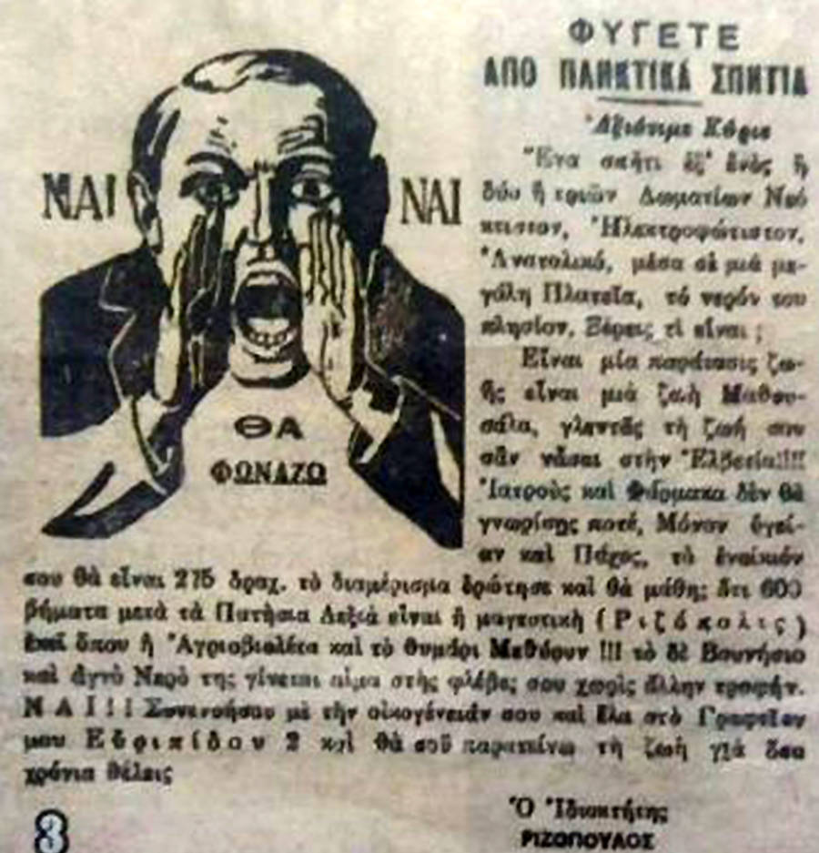 «Εάν θέλετε εξοχικήν ζωήν ευχάριστον και μαγευτικήν, τρέξατε εις την Ριζόπολιν, το μαγευτικόν προάστειον των Πατησίων. Ο Ριζόπουλος πωλεί οικόπεδα ιδιόκτητα με ευκολίες πληρωμής, με 55 δραχμάς στην Ριζόπολιν, όπου υπάρχουν ιδιόκτητα μαγαζιά και διαμερίσματα ηλεκροφώτιστα προς ενοικίασιν, με φθηνό ενοίκιον».