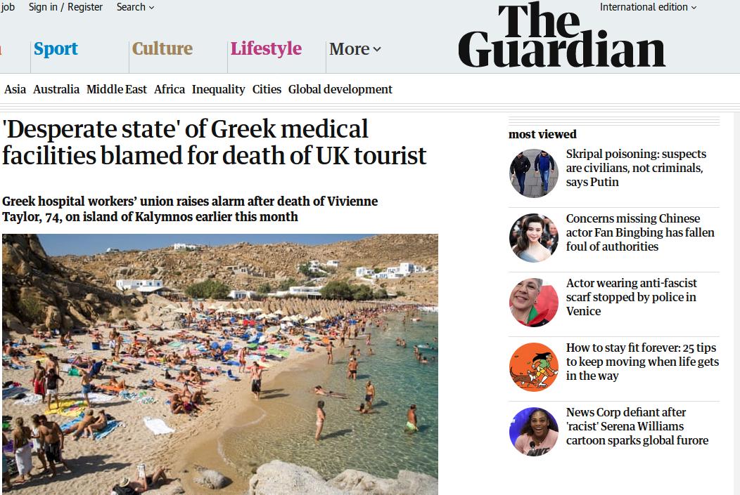 Η εφημερίδα σημειώνει ότι πάνω από τρία εκατομμύρια τουρίστες από το Ηνωμένο Βασίλειο επισκέπτονται κάθε χρόνο την Ελλάδα. «Ελάχιστοι τομείς του δημοσίου έχουν πληγεί τόσο βαριά από τις περικοπές όσο το Εθνικό Σύστημα Υγείας στην Ελλάδα στη διάρκεια της παρατεταμένης οικονομικής κρίσης…. Στις αγροτικές περιοχές σχεδόν ανύπαρκτοι είναι οι καρδιολόγοι, όπως και τα μηχανήματα ακτινοσκόπησης και άλλος βασικός εξοπλισμός», γράφει.