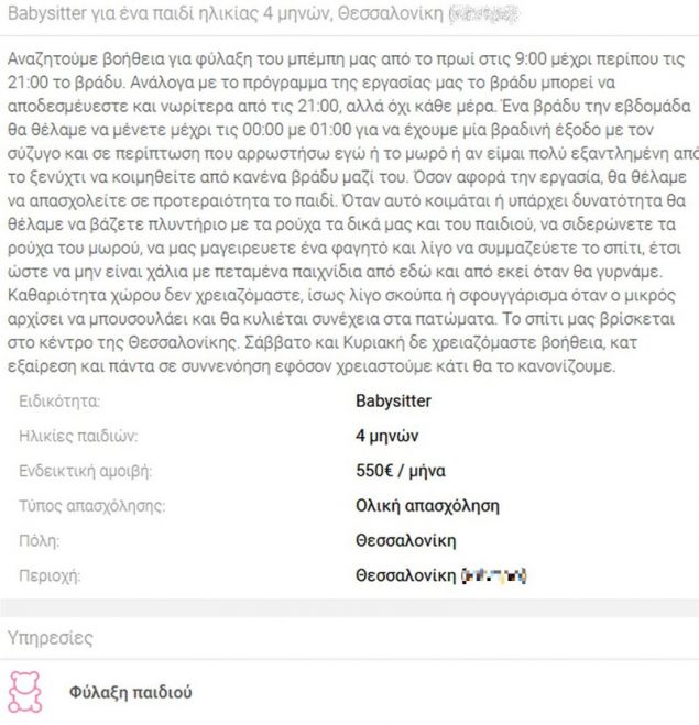 Ο λόγος; Οι γονείς ενός μπέμπη μόλις 4 μηνών ζητούν σε ένα ολόκληρο κατεβατό, από την υποψήφια babysitter όχι μόνο να φροντίζει το μωρό για 12 ώρες καθημερινά αλλά να κάνει και λίγο από όλα. Και ο μισθός; Μόλις 550 ευρώ!