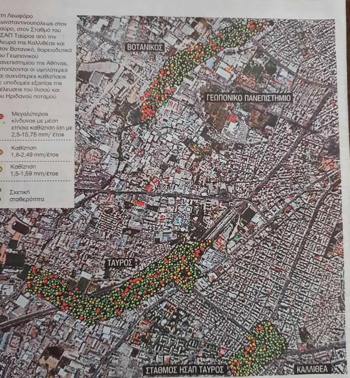 Οι υψηλότερες και συχνότερες τιμές καθιζήσεων, που ξεκινούν από τα 2,5 χιλιοστά και φτάνουν έως και τα 15,75 χιλιοστά μέσες τιμές κατ΄ έτος, εντοπίστηκαν σε τρία σημεία: Στη Λ. Κωνσταντινουπόλεως στο τμήμα του Ταύρου, στο σταθμό του ΗΣΑΠ Ταύρος από την πλευρά της Καλλιθέας – δηλαδή κοντά στο σημείου όπου βυθίστηκε το πάρκινγκ τον περασμένο Μάιο – και σε ένα τμήμα του Βοτανικού, βορειοδυτικά του Γεωπονικού Πανεπιστημίου της Αθήνας.