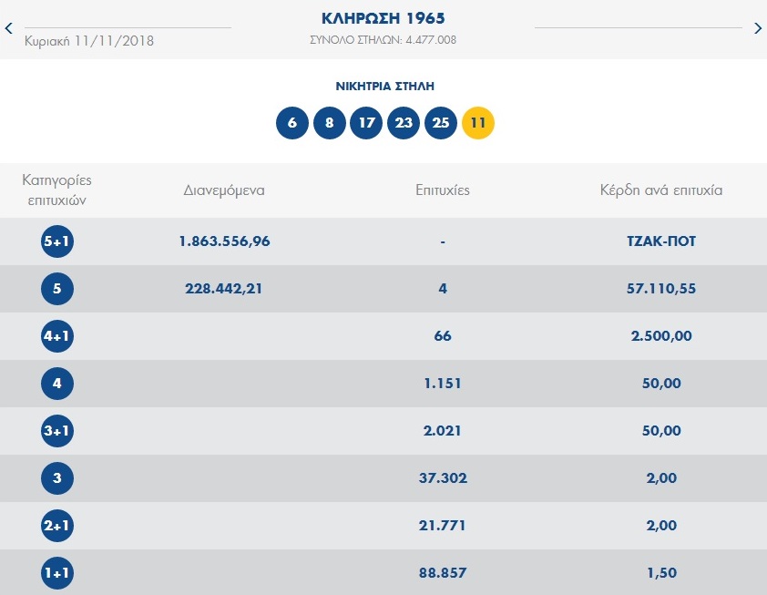 Σημειώνεται, πως οι 5 τυχεροί αριθμοί που κληρώθηκαν ήταν οι: 6, 8, 17, 23, 25 και αριθμός Τζόκερ το: 11