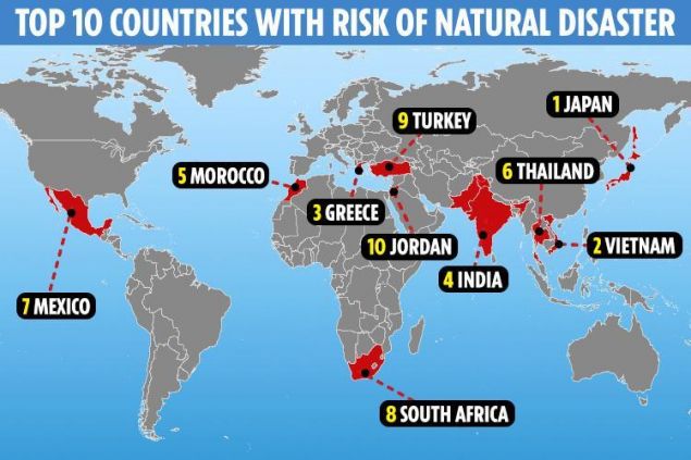 Στo Top 10 των χωρών με τα περισσότερα ρίσκα στις φυσικές καταστροφές, την πρώτη και τη δεύτερη θέση κατέχουν η Ιαπωνία και το Βιετνάμ αντίστοιχα.