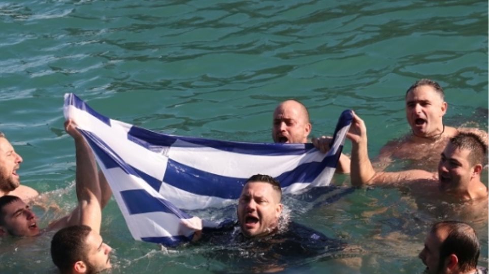 Οι κολυμβητές έπεσαν το νερό και ξεδίπλωσαν την ελληνική σημαία τραγουδώντας τον εθνικό ύμνο.