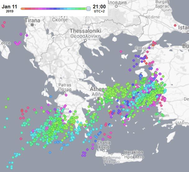 Δεκάδες όμως είναι και οι κεραυνοί που καταγράφηκαν στη χώρα, όπως φαίνεται και από τον χάρτη που παρουσιάζει τα στοιχεία από το αντίστοιχο δίκτυο καταγραφής «ΖΕΥΣ».