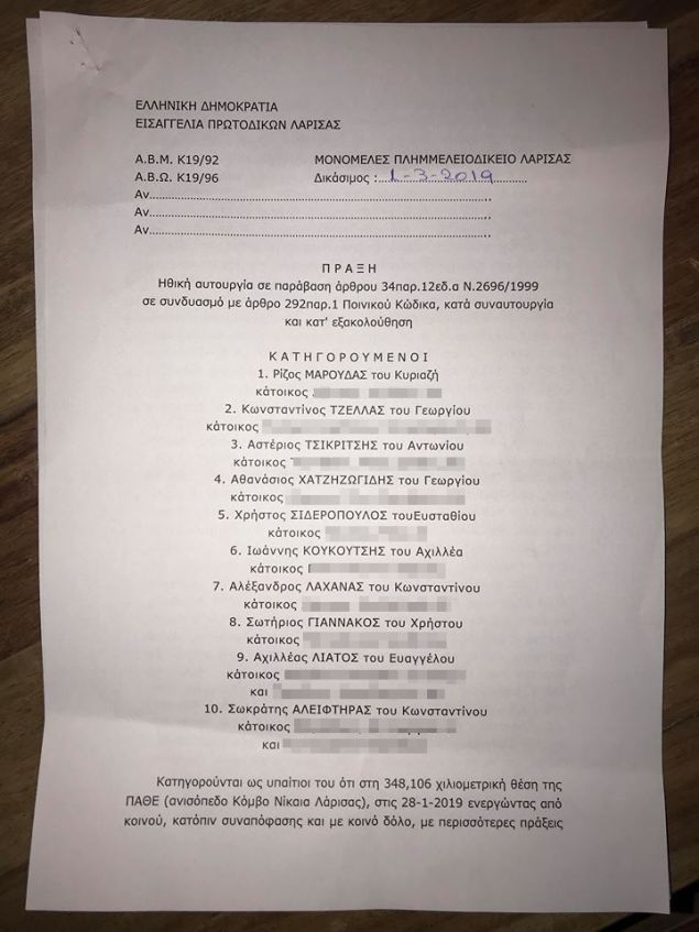Οι συγκεκριμένοι έλαβαν κλήτευση από την Εισαγγελία Πρωτοδικών Λάρισαν, με την οποία παραπέμπονται σε δίκη την 1η Μαρτίου, χωρίς απολογία, με την κατηγορία της παρακώλυσης συγκοινωνιών.