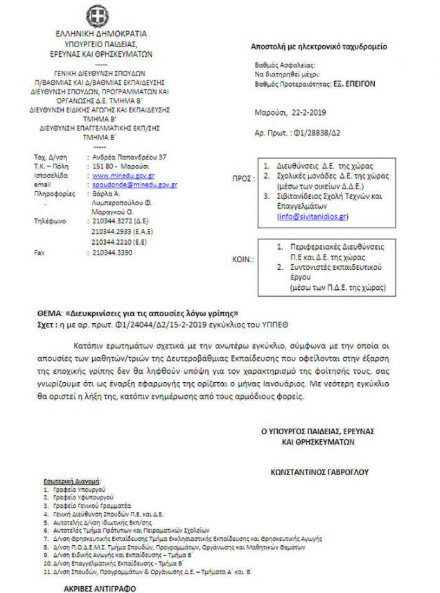 Με διευκρινιστική εγκύκλιο, σημειώνεται επίσης ότι η λήξη της εφαρμογής της εγκυκλίου -που καθόριζε τη μη προσμέτρηση των απουσιών λόγω γρίπης- θα οριστεί εκ νέου.