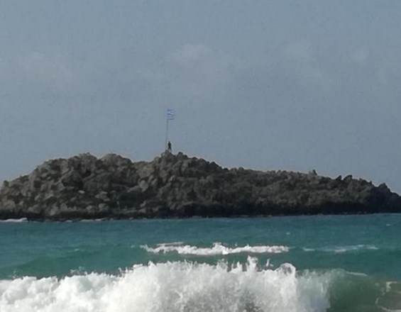 Η ελληνική σημαία, το σύμβολό μας, κυματίζει στο πιο απόκρημνο σημείο. Στημένη στο νησάκι απέναντι από την Αμνισσό στην Κρήτη, είχε κουρελιαστεί από τον αέρα και την κακοκαιρία.