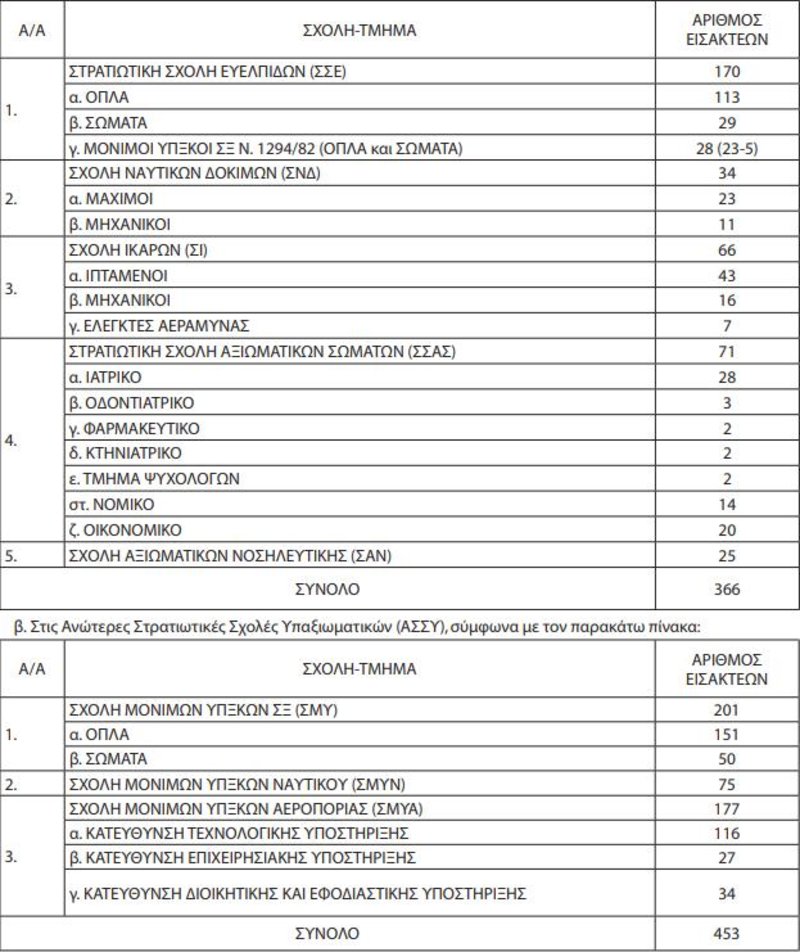 Από την Κοινή Υπουργική Απόφαση που υπεγράφη προκύπτει ότι το σύνολο των εισακτέων στα Ανώτατα Στρατιωτικά Εκπαιδευτικά Ιδρύματα και τις Ανώτερες Στρατιωτικές Σχολές Υπαξιωματικών ανέρχεται στους 819.