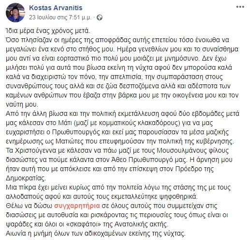 Συγκλονίζει η τελευταία ανάρτηση που είχε κάνει στο facebook ο ήρωας ψαράς Κώστας Αρβανίτης που έσωσε δεκάδες ανθρώπους στο Μάτι την 23η Ιουλίου. Την αποφράδα εκείνη ημέρα είχε γενέθλια.