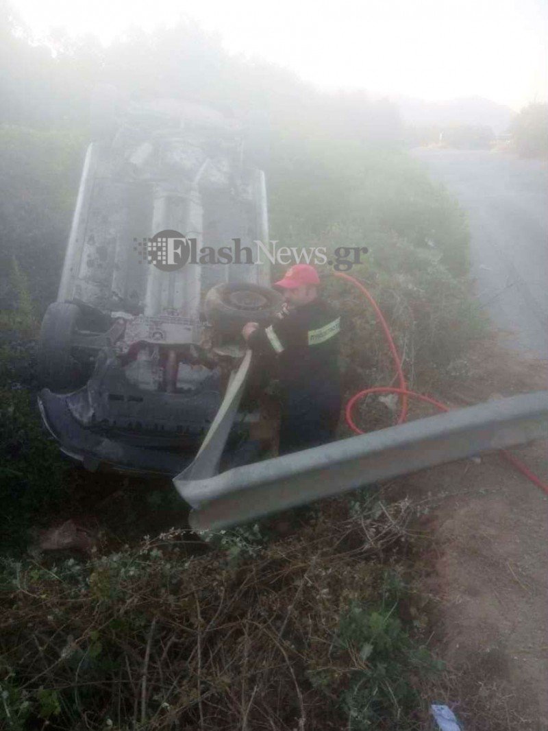 Το αυτοκίνητο στο πρώτο χιλιόμετρο του δρόμου από Γεωργιούπολη προς την λίμνη του Κουρνά στα Χανιά, είχε βγει από τον δρόμο και είχε πέσει αναποδογυρισμένο πάνω στην μεταλλική μπάρα η οποία το εμβόλισε!