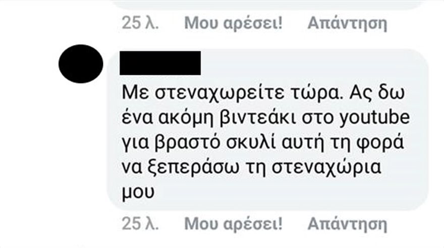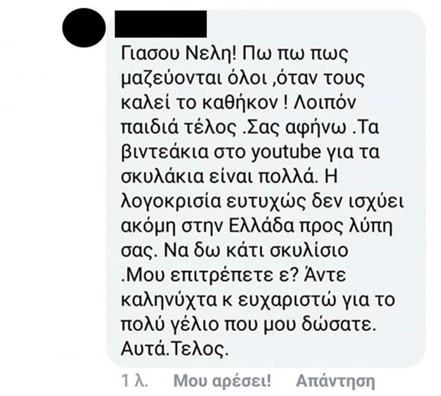 Η απάντηση που έδωσε ο δάσκαλος που καταγγέλθηκε από γονείς στη Διεύθυνση Πρωτοβάθμιας Εκπαίδευσης εξ αιτίας αναρτήσεών του στο facebook για τα αδέσποτα σκυλιά, αναφέρει: «Απαντώντας στην ανάρτηση που με αφορά, έχω να δηλώσω ότι, όπως φαίνεται και από τα αποσπάσματα που δημοσιεύσατε, είναι καθαρή περίπτωση τρολλαρίσματος και φυσικά ούτε στην Κίνα πήγα, ούτε τρώω σκυλιά. Προτιμώ μεσογειακή διατροφή!».