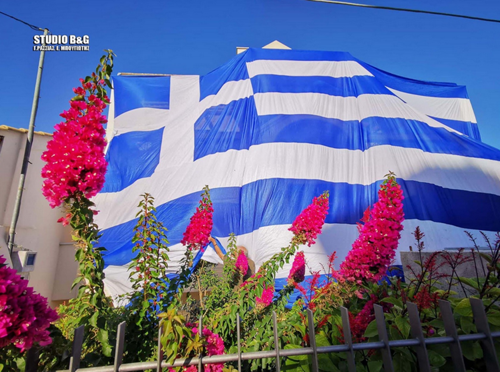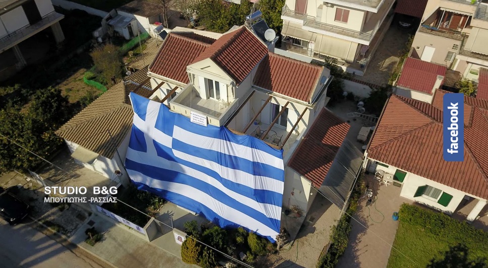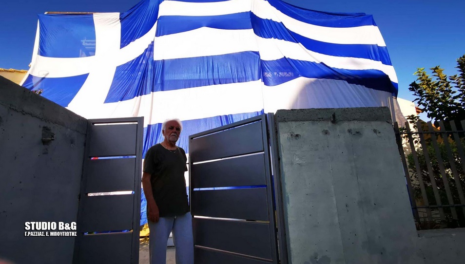Με μία ελληνική σημαία 140 τετραγωνικών μέτρων κάλυψε το σπίτι του στη Νέα Κίο Αργολίδας ο Γιάννης Αθανασόπουλος αντιδήμαρχος του Δήμου Άργους Μυκηνών, για τον εορτασμό της 28ης Οκτωβρίου 1940.