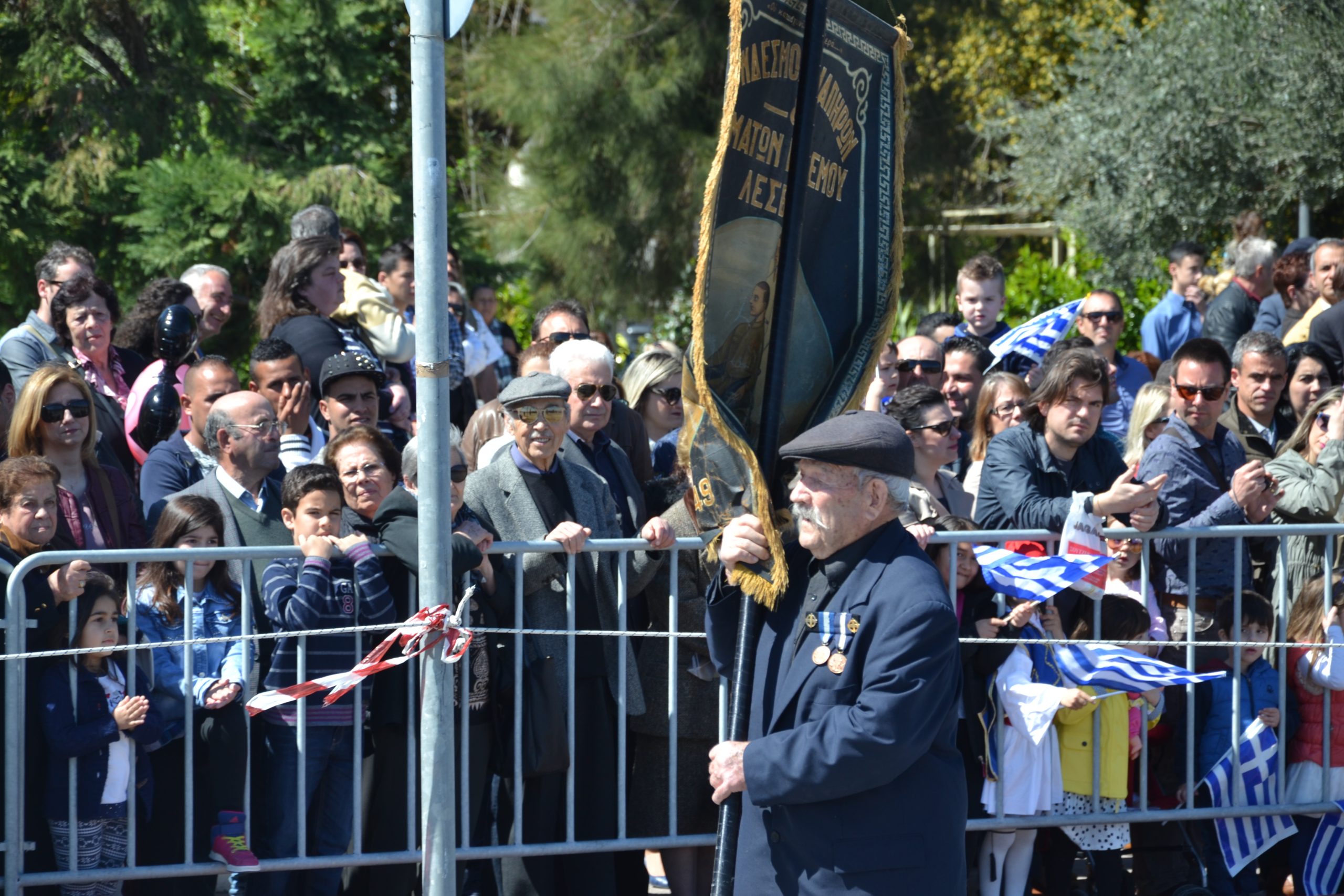 Τα τελευταία χρόνια σαν φτάσει μπροστά στην εξέδρα των επισήμων ο δήμαρχος τον οδηγεί πάνω δίπλα στους επισήμους. Σήμερα το ίδιο έγινε από το δήμαρχο Μυτιλήνης Στρατή Κύτελη και τον περιφερειάρχη βορείου Αιγαίου Κώστα Μουτζούρη. «Καλά ήταν;» τον ρωτάμε. Γελά… «Του χρόνου άμα έχω φύγει να πάρετε δυο νέοι το λάβαρο και να το περάσετε στην προκυμαία. Να ησυχάσουν οι ψυχές όλων. Άντε γεια τώρα. Και να αντέχετε. Όλα τα μπορούμε…».