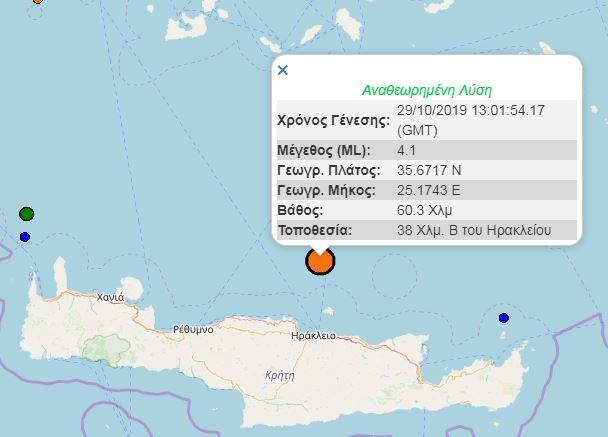 Ο σεισμός σημειώθηκε στις 15:01 το μεσημέρι της Τρίτης και σύμφωνα με την αναθεωρημένη λύση του Γεωδυναμικού Ινστιτούτο είχε επίκεντρο 38 χλμ βόρεια του Ηρακλείου και βάθος 60,3 χλμ.