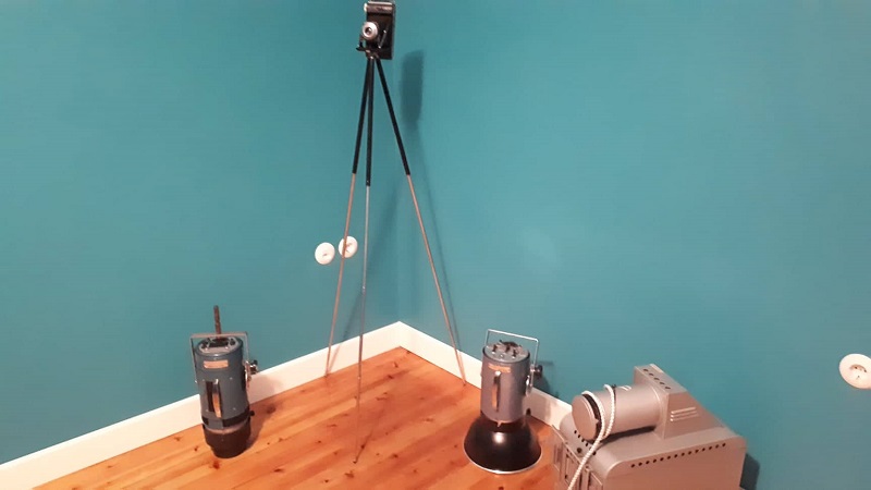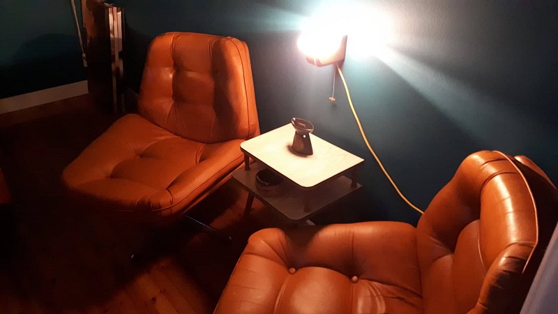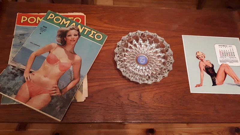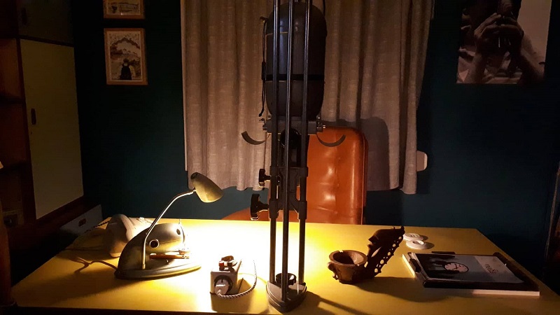 Δύο πολυθρόνες και το γραφείο είναι της δεκαετίας του ’60. Το έπιπλο του γραφείου έχει αναπαλαιωθεί. Οι δύο πολυθρόνες είναι γνήσιες δερμάτινες εισαγωγής από την Αυστρία, ενώ ο εμφανιστής φιλμ πάνω στο γραφείο είναι πλήρως λειτουργικός.