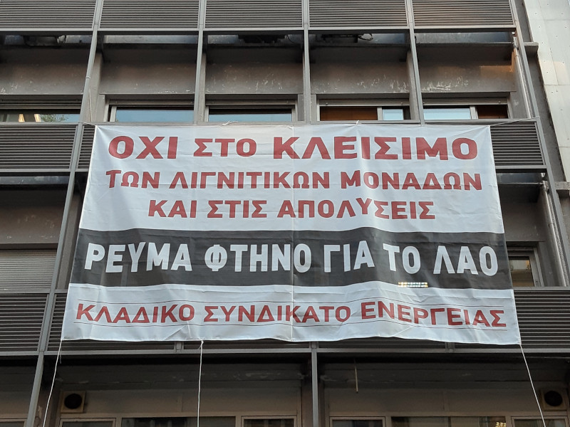 Μάλιστα ανήρτησαν και πανό στην πρόσοψη του κτιρίου. Τα μέλη του ΠΑΜΕ αντιδρούν στο κλείσιμο των λιγνιτικών μονάδων και στις απολύσεις, ενώ ζητούν «φτηνό ρεύμα για το λαό».