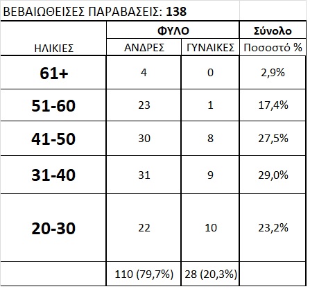 Ειδικότερα το 29% των παραβατών είναι ηλικία 31 – 40 ετών, 27,5% από 41 – 50 ετών, 23,2% από 20 – 30 ετών, 17,4% από 51 – 60 ετών και 2,9% από 61 ετών και άνω. Επίσης στη συντριπτική πλειοψηφία τους (110) είναι άντρες.
