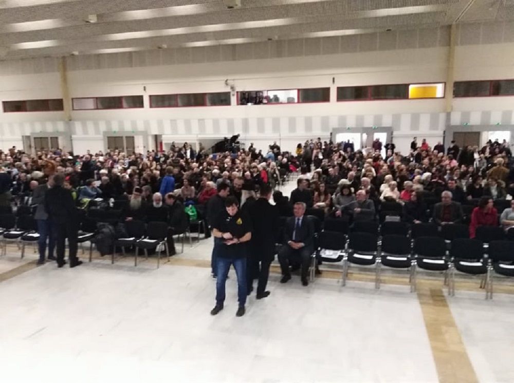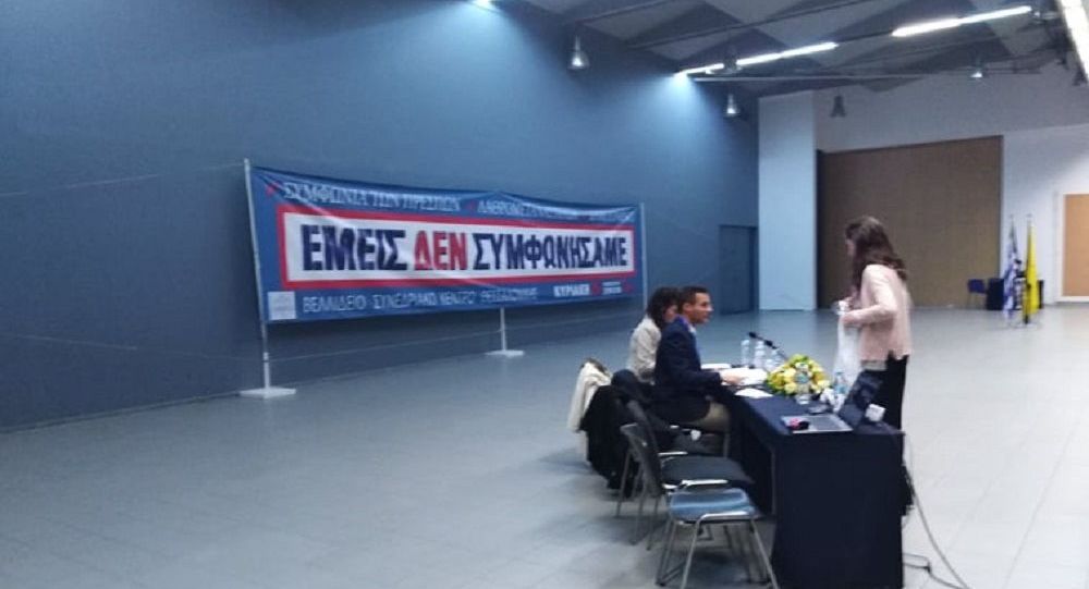 Εκδήλωση, υπό τον τίτλο «Εμείς ΔΕΝ συμφωνήσαμε», λαμβάνει χώρα στο Βελλίδειο Συνεδριακό Κέντρο της Θεσσαλονίκης. Κατάμεστη η αίθουσα με ανθρώπους κάθε ηλικίας.