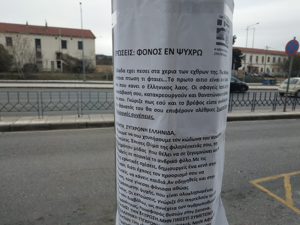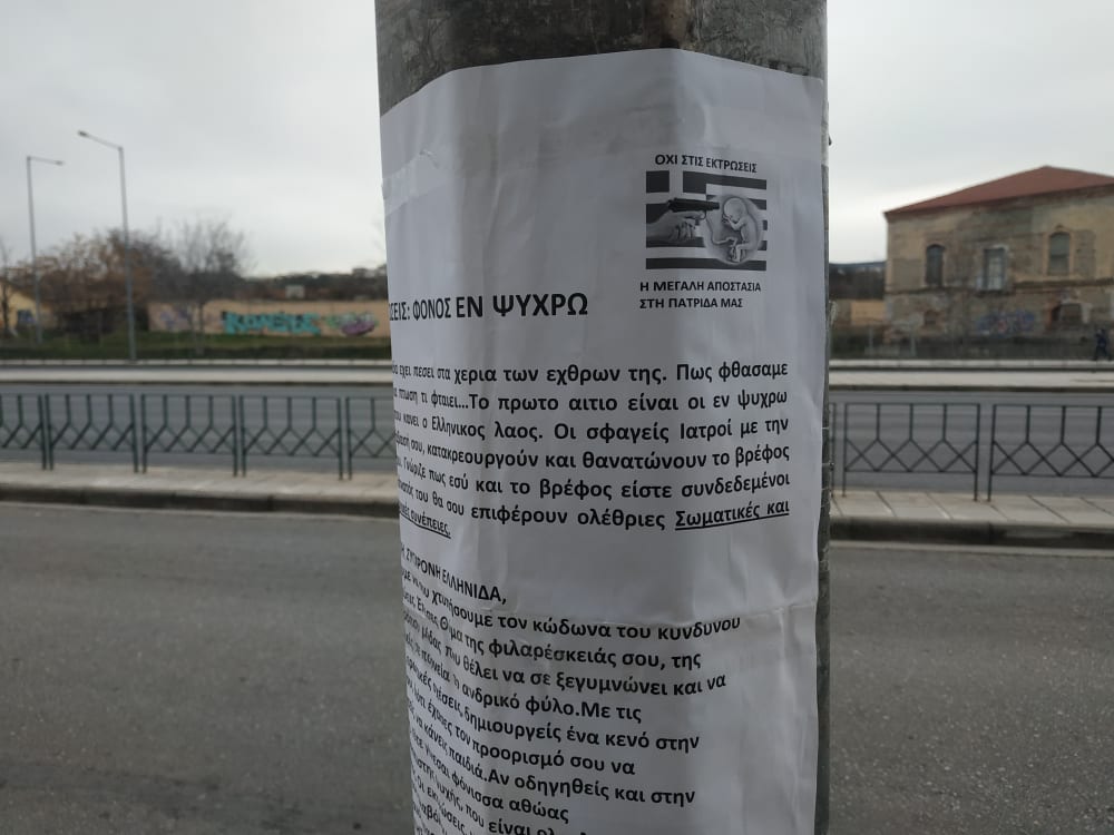 «Εκτρώσεις: Φόνος εν ψυχρώ» είναι ο τίτλος ενώ ακολουθεί και ένα κείμενο κατά των εκτρώσεων. «Η ελλαδα έχει πέσει στα χέρια των εχθρών της, μπορούμε να σου χτυπήσουμε τον κώδωνα του κινδύνου, έπεσες θύμα της φιλαρέσκειάς σου. Εσυ και το βρέφος είσαστε συνδεδεμένοι και ο θάνατός του θα σου επιφέρει ολέθριες σωματικές και ψυχολογικές συνέπειες» γράφει μεταξύ άλλων. Δείτε τις φωτογραφίες από την οδό Λαγκαδά στη Θεσσαλονίκη