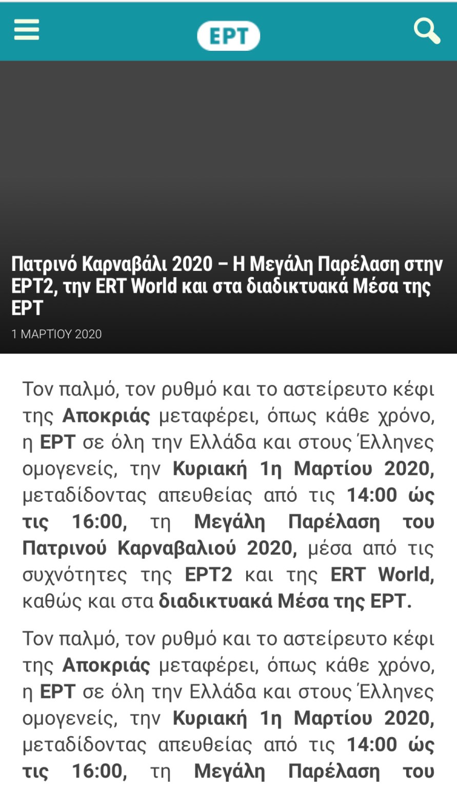 «Τον παλμό, τον ρυθμό και το αστείρευτο κέφι της Αποκριάς μεταφέρει, όπως κάθε χρόνο, η ΕΡΤ σε όλη την Ελλάδα και στους Έλληνες ομογενείς, την Κυριακή 1η Μαρτίου 2020,μεταδίδοντας απευθείας από τις 14:00 ώς τις 16:00, τη Μεγάλη Παρέλαση του Πατρινού Καρναβαλιού 2020, μέσα από τις συχνότητες της ΕΡΤ2 και της ERT World, καθώς και στα διαδικτυακά Μέσα της ΕΡΤ. Τον παλμό, τον ρυθμό και το αστείρευτο κέφι της Αποκριάς μεταφέρει, όπως κάθε χρόνο, η ΕΡΤ σε όλη την Ελλάδα και στους Έλληνες ομογενείς, την Κυριακή 1η Μαρτίου 2020, μεταδίδοντας απευθείας από τις 14:00 ώς τις 16:00, τη Μεγάλη Παρέλαση του Πατρινού Καρναβαλιού 2020, μέσα από τις συχνότητες της ΕΡΤ2 και της ERT World, καθώς και στα διαδικτυακά Μέσα της ΕΡΤ.