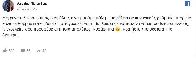 «Μέχρι να τελειώσει αυτός ο εφιάλτης και να μπούμε πάλι με ασφάλεια σε κανονικούς ρυθμούς μπορείτε εσείς οι Κομμουνιστές, Ζαίοι και παπαγαλάκια να το βουλώσετε και να πάτε να γ…ωπλυθείτε επιτέλους;
