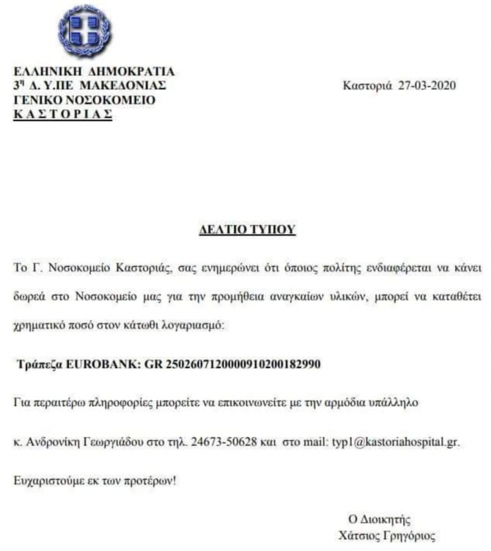 Ο διοικητής του νοσοκομείου της Καστοριάς, της πόλης που έχει πληγεί βαριά από τον κορονοϊό , με χθεσινό του έγγραφο ενημερώνει τους πολίτες ότι όποιος θέλει μπορεί να κάνει δωρεά στο νοσοκομείο “για την προμήθεια αναγκαίων υλικών”. Στο έγγραφο υπάρχει και τραπεζικός λογαριασμός.