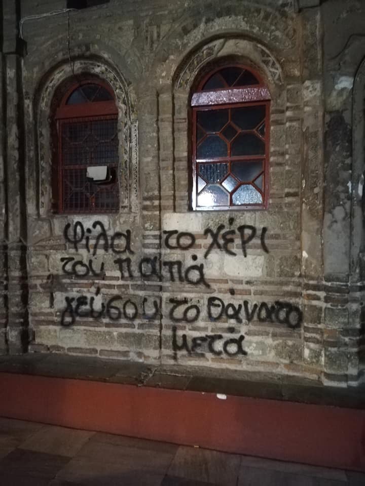 «Φίλα το χέρι του παπά γεύσου τον θάνατο μετά», έγραψαν οι βάνδαλοι στο ναό που βρίσκεται στην οδό Ολυμπιαδός.