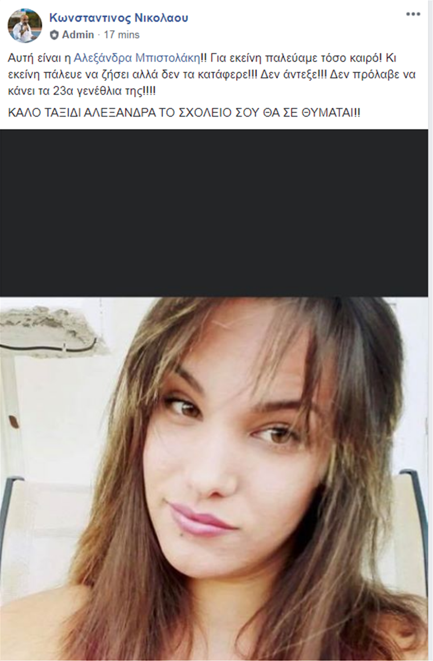 Από τη στιγμή που έγινε γνωστή η είδηση του θανάτου της νεαρής Αλεξάνδρας , οι φίλοι έσπευσαν να την αποχαιρετίσουν μέσω Facebook αλλά και να εκφράσουν την οργή τους για τον άδικο χαμό της κοπέλας .