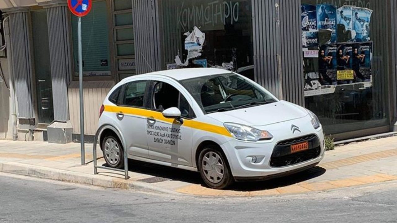 Σε αυτή λοιπόν φαίνεται ένα αυτοκίνητο του Δήμου Χανίων να είναι παρκαρισμένο πάνω στο πεζοδρόμιο και συγκεκριμένα στην ράμπα που χρησιμεύει για ΑΜΕΑ.
