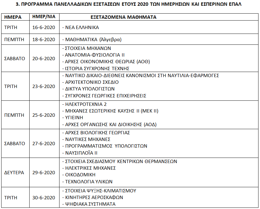 Τέλος, σημειώνεται ότι όσον αφορά το χρονικό διάστημα διεξαγωγής των Υγειονομικών Εξετάσεων και της Πρακτικής Δοκιμασίας των υποψηφίων στις Πανελλήνιες 2020 για εισαγωγή στα Τμήματα Επιστήμης Φυσικής Αγωγής και Αθλητισμού, αυτό έχει οριστεί από τις 29 Ιουνίου έως και τις 10 Ιουλίου.
