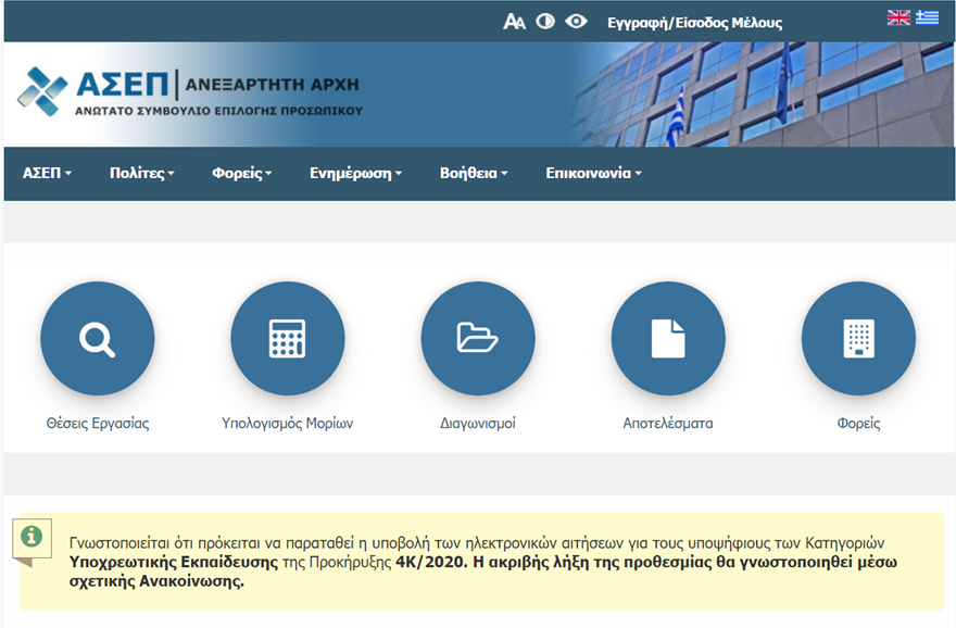 Γνωστοποιείται ότι πρόκειται να παραταθεί η υποβολή των ηλεκτρονικών αιτήσεων για τους υποψήφιους των Κατηγοριών Υποχρεωτικής Εκπαίδευσης της Προκήρυξης 4Κ/2020. Η ακριβής λήξη της προθεσμίας θα γνωστοποιηθεί μέσω σχετικής Ανακοίνωσης.