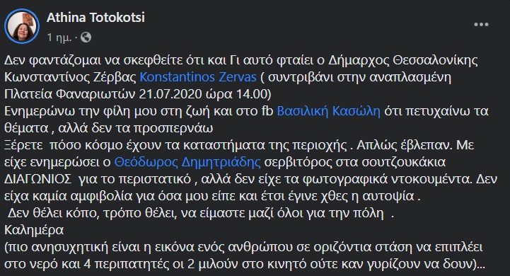 Το περιστατικό μαζί με τις φωτογραφίες δημοσίευσε στο λογαριασμό της στο facebook η κ. Αθηνά Τοτοκώτση, Γενική Γραμματέας της «Ηπειρωτικής Εστίας Θεσσαλονίκης».