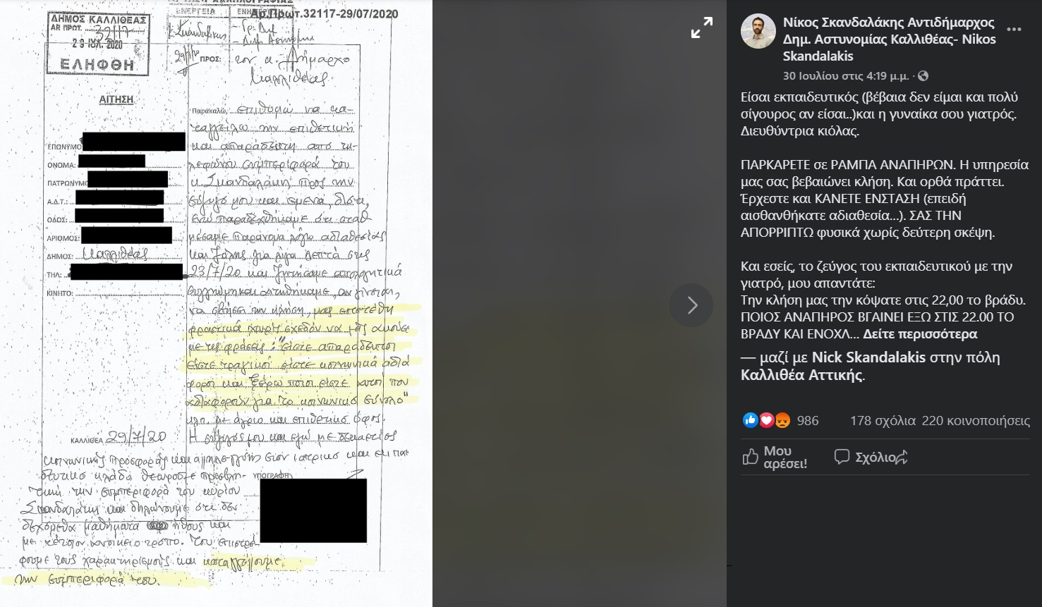 Διαβάστε αναλυτικά το ποστάρισμά του, στο οποίο περιλαμβάνεται σε φωτογραφία και η καταγγελία που έγινε εις βάρος του.