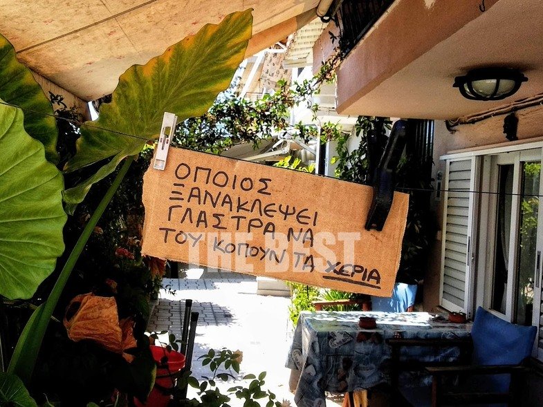 Προφανώς έχουν κλαπεί αρκετές από την αυλή τους, γεγονός που τους «ανάγκασε», να κρεμάσουν χάρτινη ταμπέλα που έγραφε «όποιος ξανακλέψει γλάστρα να του κοπούν τα χέρια».
