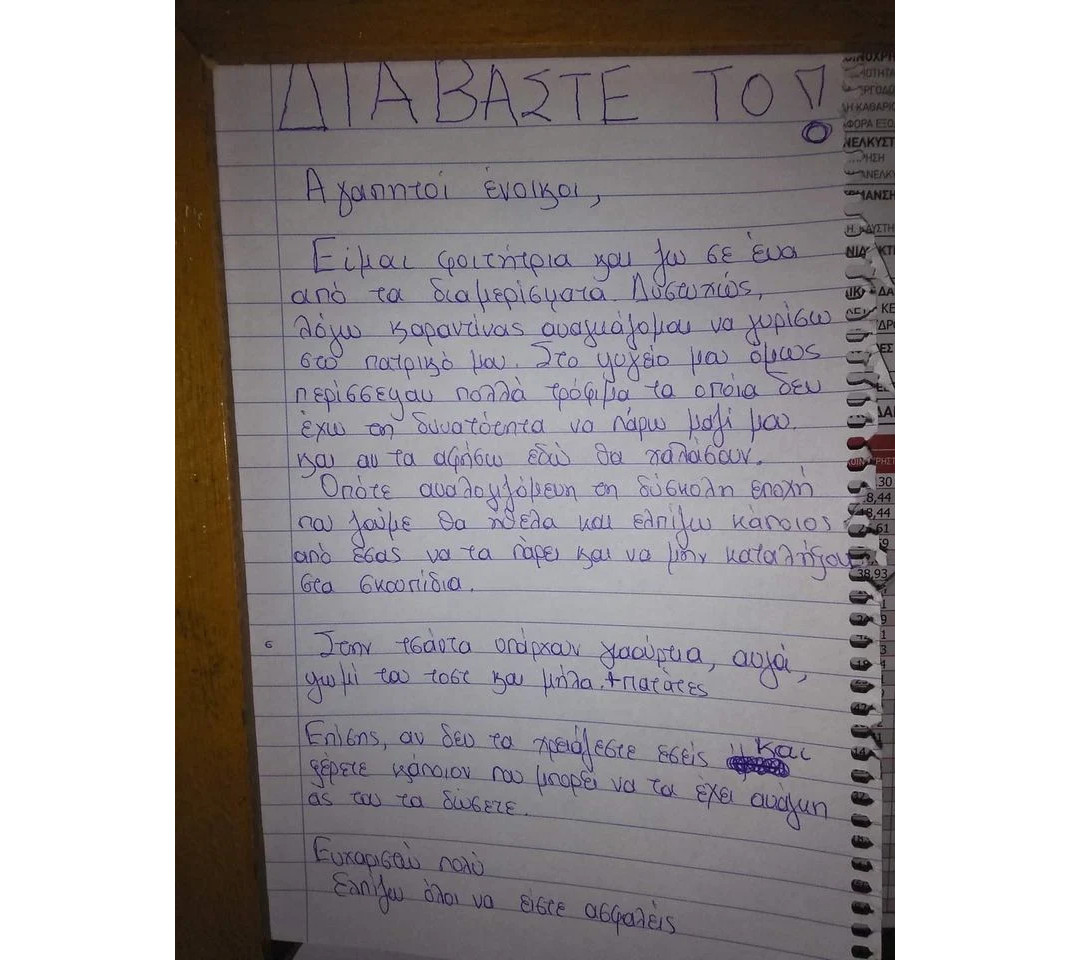 Η φοιτήτρια μάλιστα αναφέρει στο σημείωμα ότι αν δεν χρειάζονται οι ένοικοι κάτι από αυτά, μπορούν κάλλιστα να τα δώσουν σε κάποιους άλλους που τα έχουν ανάγκη.