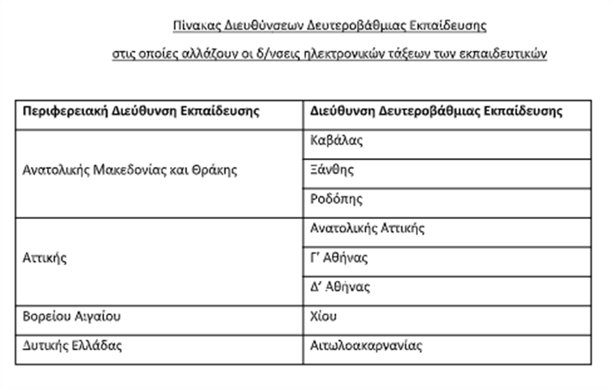 Πίνακας Διευθύνσεων Δευτεροβάθμιας Εκπαίδευσης στις οποίες αλλάζουν οι δ/νσεις ηλεκτρονικών τάξεων των εκπαιδευτικών.