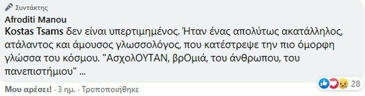 «O κ. Μπαμπινιώτης δεν κατάργησε το ωμέγα απ’ τα ελληνικά; Δεν κατάργησε το πολυτονικό; Δεν μετάλλαξε τη γλώσσα μας, έτσι που να μην τη μαθαίνει κανείς; Δεν την άφησε ανοχύρωτη σε κάθε επέμβαση και παραμόρφωση; Τώρα παραπονιέται για το Take away;» έγραψε στο Facebook.