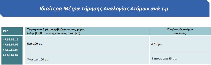 Στα καταστήματα που θα λειτουργήσουν από τις 7 Δεκεμβρίου ορίζεται ως υποχρεωτική η αναλογία 4 ατόμων ανά 100 τ.μ, ενώ για όσα είναι πάνω από 100 τ.μ. ισχύει η αναλογία ενός ατόμου ανά 15 τ.μ.