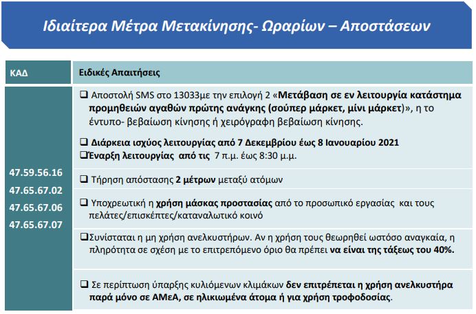 Για την μετάβαση στο κατάστημα απαιτείται η αποστολή SMS στο 13033 με την επιλογή 2 ή συμπληρωμένο έντυπο βεβαίωσης κίνησης ή και χειρόγραφη βεβαίωση για μετάβαση σε εν λειτουργία κατάστημα προμηθειών αγαθών πρώτης ανάγκης (σούπερ μάρκετ).