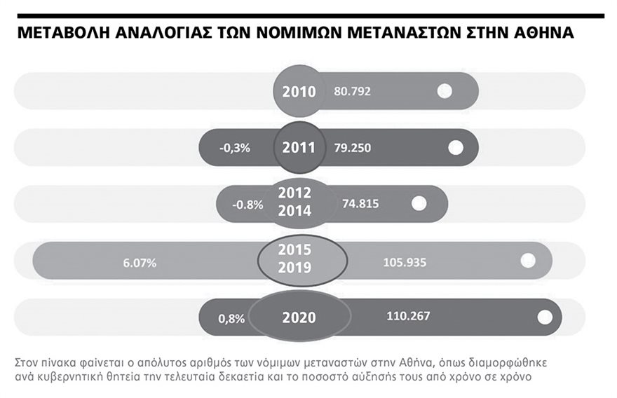 Από 74.815 στα τέλη του 2014 οι νόμιμοι μετανάστες που κατοικούν στο Δήμο Αθηναίων στο τέλος του 2019 αυξήθηκαν σε 105.935. Δηλαδή σε διάστημα πέντε ετών στον μόνιμο μεταναστευτικό καταγεγραμμένο πληθυσμό του δήμου της πρωτεύουσας προστέθηκαν 31.120 άτομα, δηλαδή πρόσωπα των οποίων η αίτηση ασύλου εγκρίθηκε και οι οποίοι έλαβαν ταυτότητα δηλώνοντας διεύθυνση μόνιμης κατοικίας στην πρωτεύουσα.