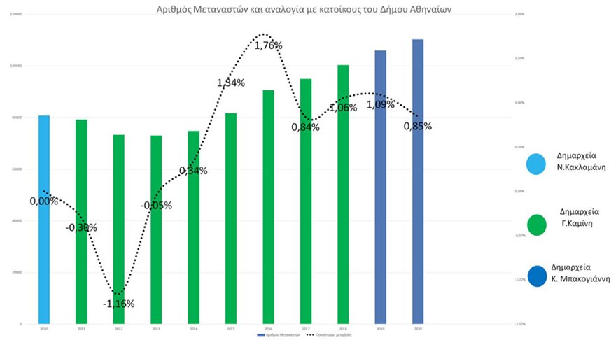 Σύμφωνα με το υπουργείο Μετανάστευσης και Ασύλου, την περίοδο 2015-2019 καταγράφηκε η μεγαλύτερη αύξηση νόμιμων μεταναστών στον Δήμο Αθηναίων.