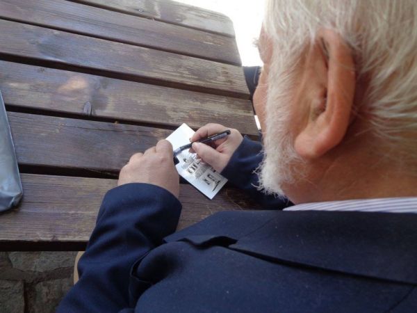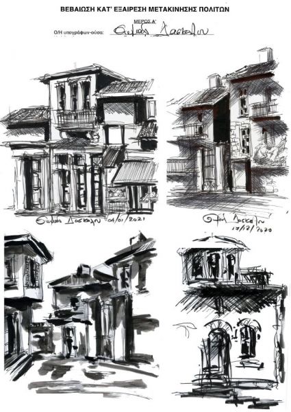 Όπως λέει «συνεχίζω σε κάθε μου έξοδο να αποτυπώνω στο πίσω μέρος της «ΒΕΒΑΙΩΣΗΣ ΚΑΤ’ ΕΞΑΙΡΕΣΗ ΜΕΤΑΚΙΝΗΣΗΣ ΠΟΛΙΤΩΝ» διάφορες χαρακτηριστικές αρχιτεκτονικές γωνιές της όμορφης πόλεώς μας (σ.σ. Τρίκαλα). Έχω μέχρι τώρα πάνω από 200 τέτοια στιγμιαία σκίτσα, τα οποία θα θυμίζουν αυτή την αποτρόπαια παγερή απαγορευτική περίοδο κατά την οποία χάσαμε το πρόσωπο του πλησίον μας».