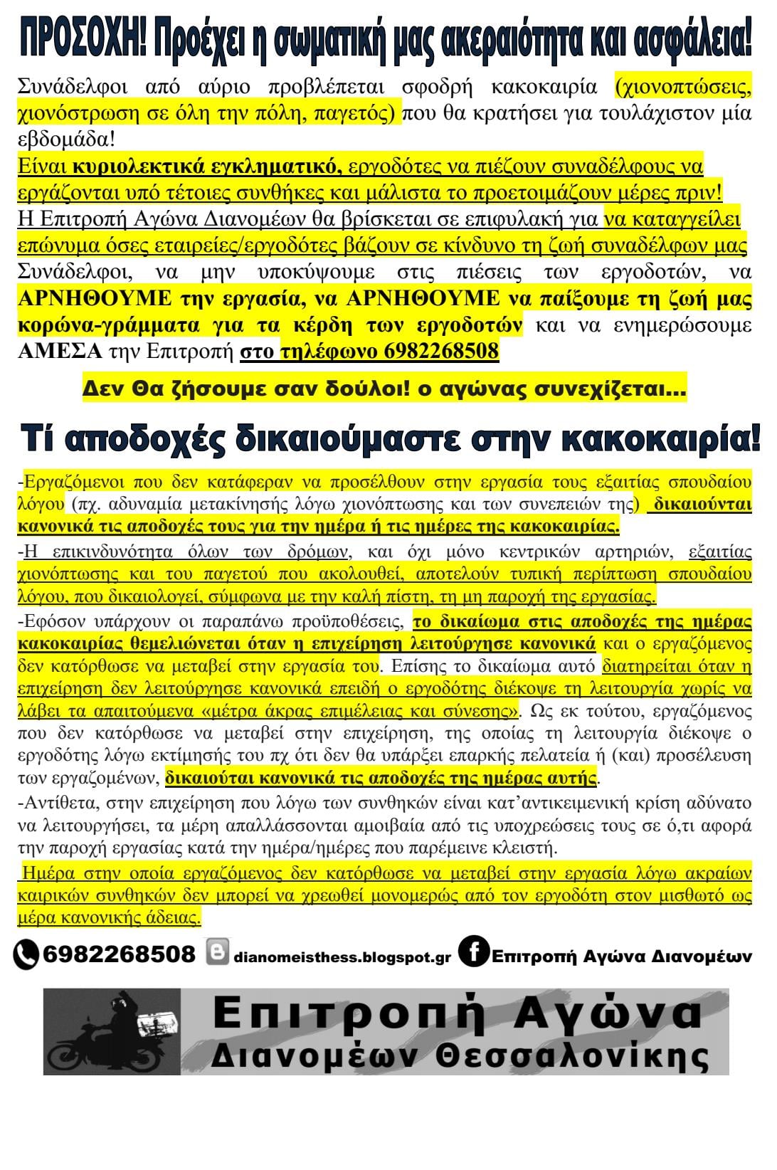 «Προβλέπεται σφοδρή κακοκαιρία που θα κρατήσει τουλάχιστον μία εβδομάδα. Είναι κυριολεκτικά εγκληματικό, εργοδότες να πιέζουν συναδέλφους να εργάζονται υπό τέτοιες συνθήκες και μάλιστα το προετοιμάζουν μέρες πριν! Η Επιτροπή Αγώνα Διανομέων θα βρίσκεται σε επιφυλακή για να καταγγείλει επώνυμα όσες εταιρείες/εργοδότες βάζουν σε κίνδυνο τη ζωή συναδέλφων μας. Συνάδελφοι, να μην υποκύψουμε στις πιέσεις των εργοδοτών, να ΑΡΝΗΘΟΥΜΕ την εργασία, να ΑΡΝΗΘΟΥΜΕ να παίξουμε τη ζωή μας κορώνα-γράμματα για τα κέρδη των εργοδοτών και να ενημερώσουμε ΑΜΕΣΑ την Επιτροπή».