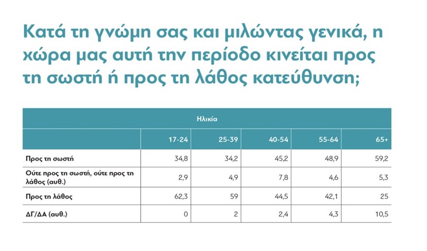 Το ποσοστό όσων πιστεύουν ότι πάμε προς τη σωστή κατεύθυνση είναι πια το 46% με κυρίαρχη την ομάδα 17-24 που θεωρούν κατά 62,3% ότι πηγαίνουν προς την λάθος κατεύθυνση.
