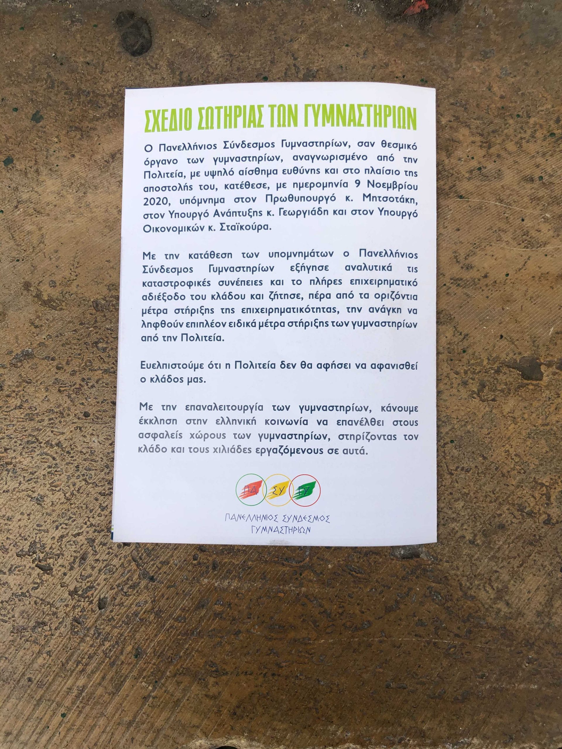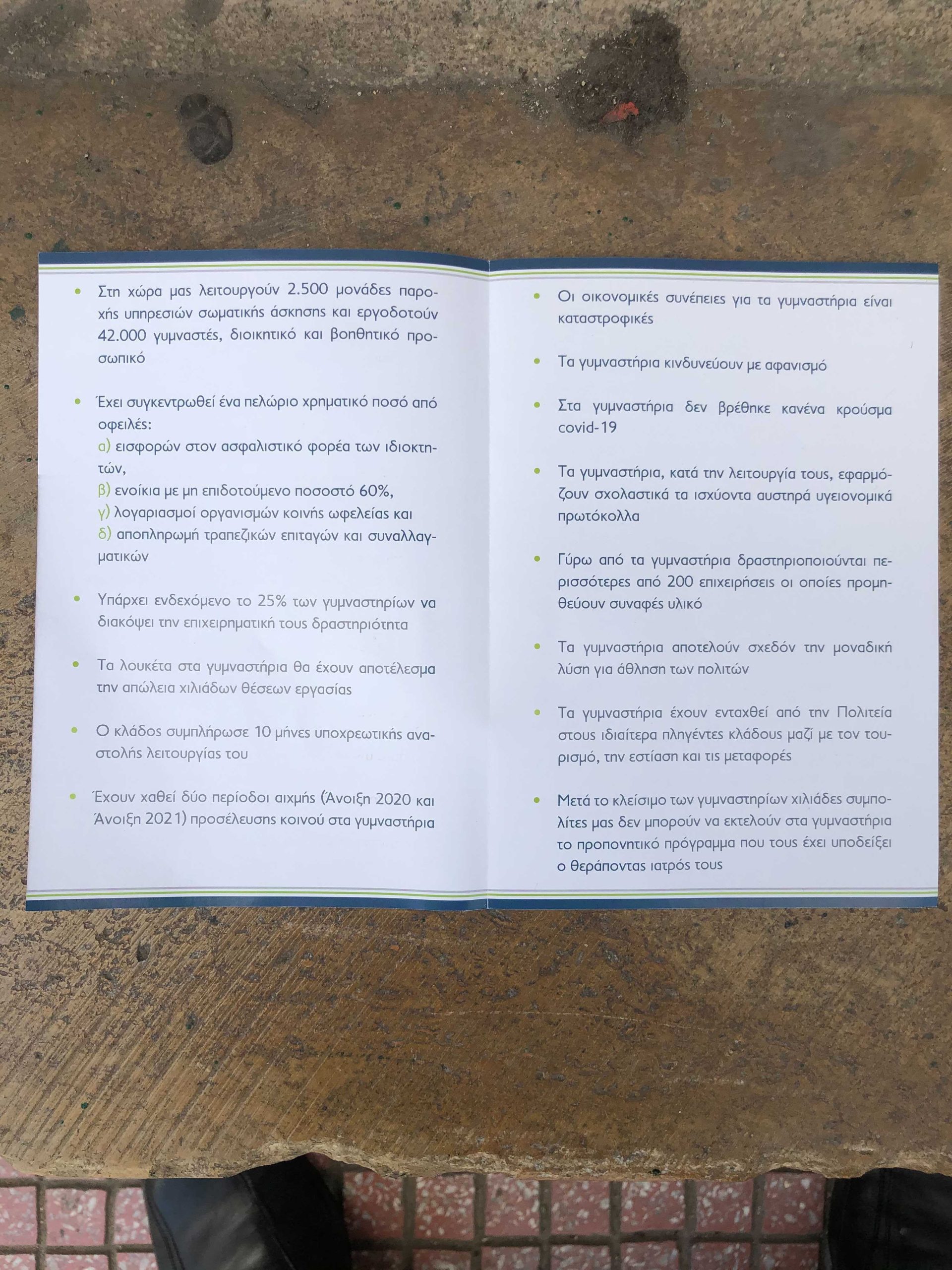 Όπως χαρακτηριστικά αναφέρουν στο πανό τους «τα γυμναστήρια είναι μέρος της λύσης. Όχι το πρόβλημα».