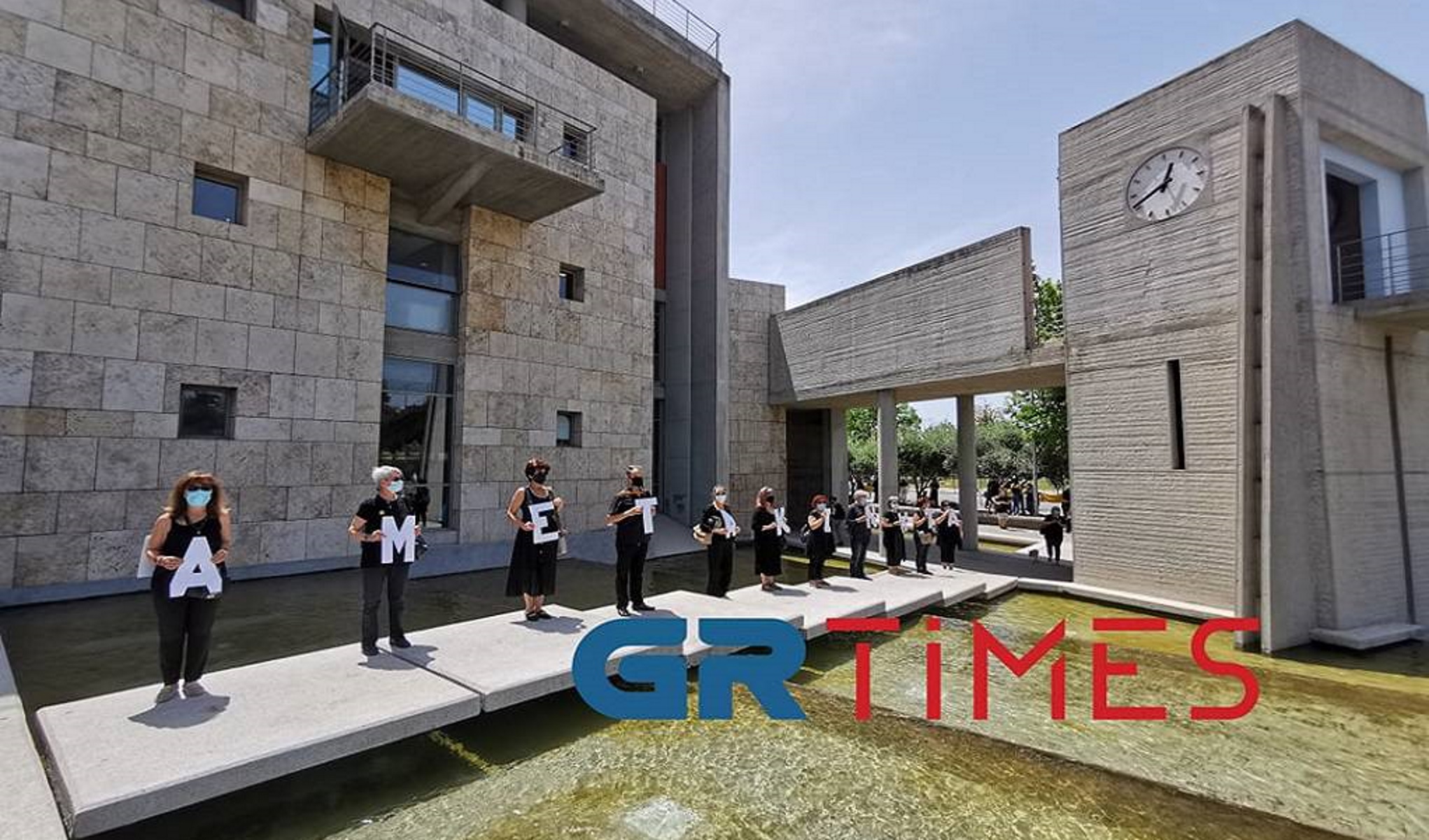 Στην κινητοποίηση μπροστά από το δημαρχείο στη Θεσσαλονίκη παίρνουν μέρος μέλη της Κίνησης Πολιτών για την προστασία της πολιτιστικής κληρονομιάς.