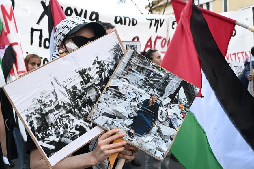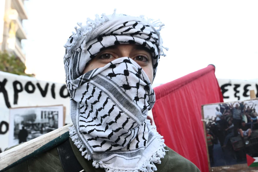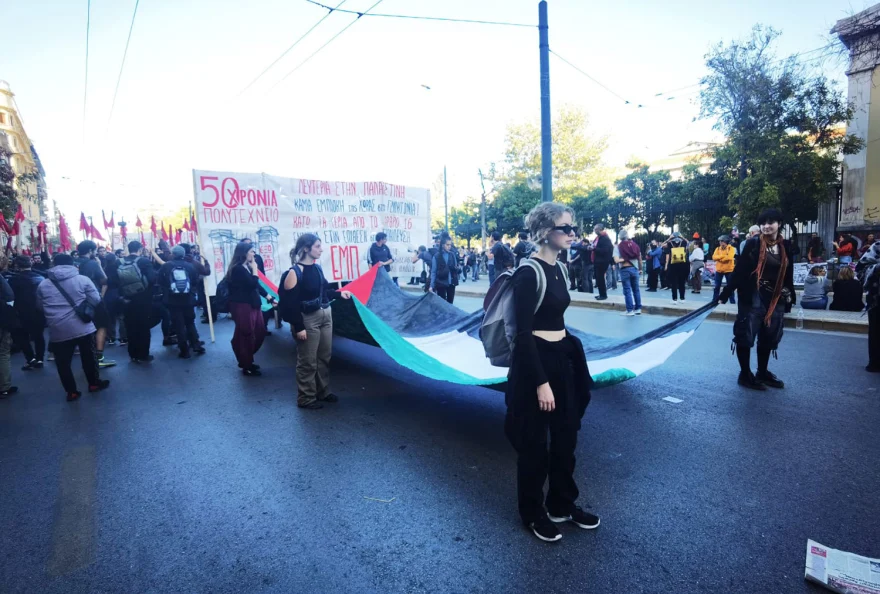 Με σημαίες της Παλαιστίνης, διαδηλώνουν οι φοιτητές που συμμετέχουν στην πορεία-προσυγκέντρωση της μεγάλης πορείας για τα 50 χρόνια από την εξέγερση του Πολυτεχνείου.
